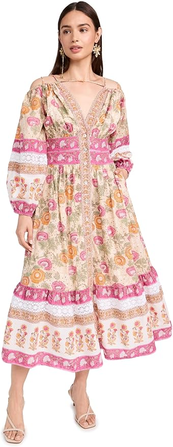 Ruffle hem with crochet lace trim, Colorblock floral print, Elastic straps and neckline, Cold-shoulder silhouette
